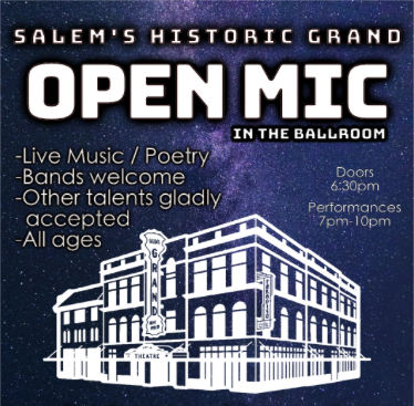 Salem's Historic Grand is pleased to invite performers of all varieties to take the ballroom stage the first Tuesday of every month! Musicians, bands, poets, and all other performers are encouraged to sign up and share your talent! Hosted by Matador Hamilton and Danny Shaw of Giantess.